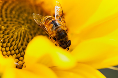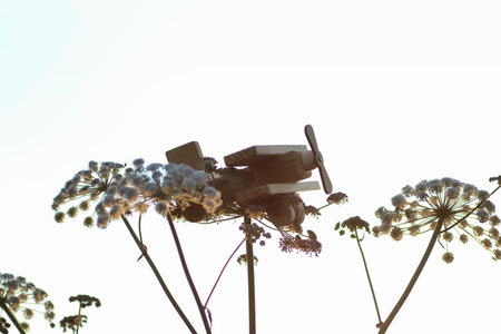 Small flying wasp is going to land on small flower. Macro photography, green smooth background, wasp caught in fly.