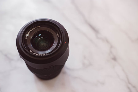 Vintage manual focus lens in blur. Standard lens. Vintage analog photographic equipment with shallow depth of field.