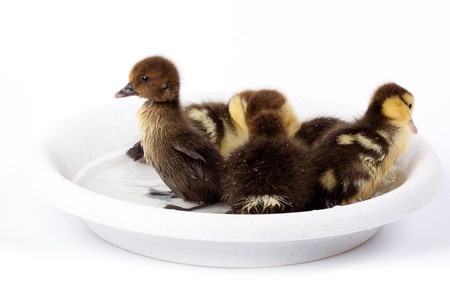 Yellow gosling on white background,Cute little newborn yellow fluffy gosling.