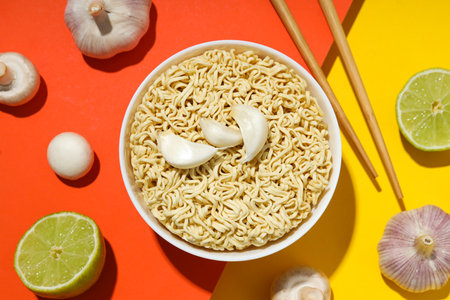 Concept of instant food, instant noodles, top view
