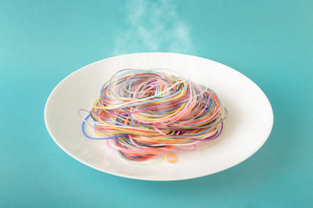 Colored cables on a plate from which steam comes out on a blue background. A concept inspired by spaghetti and food. Minimal photography style.