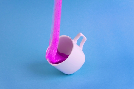 Bright pink glitter slime comes in mug. White cup on blue background. Art neon surrealism and minimalism concept