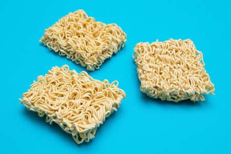 Uncooked Instant Noodles on Blue Background. Raw Pasta. Dry Asian Fast Food. Quick Lunch