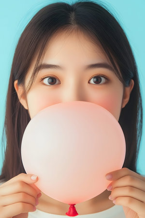 Young Asian Woman Holding a Pink Balloon in Front of Her Face