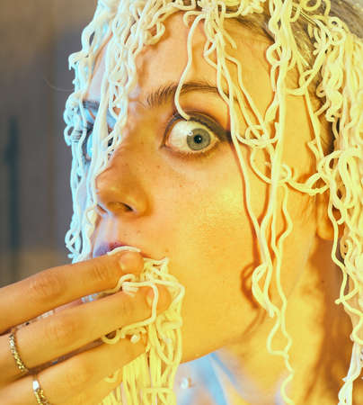 Funny hungry girl with curly noodles on her head.