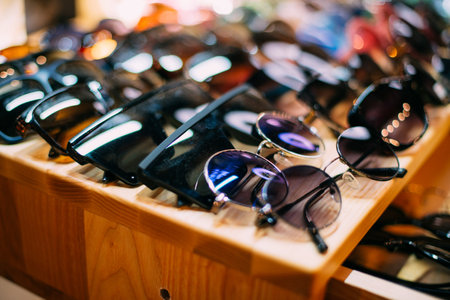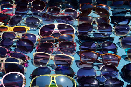 Bright colorful yellow and other colors sunglasses on wood background with copy space that popular use in beach and tropical tourist destination.