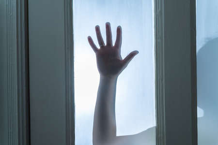 Horror, halloween background - Shadowy figure behind glass holding a knife