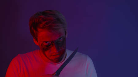 Angry man, maniac or crazy, licks a knife standing in a dark room. Portrait man with a knife. Concept: Serial killer maniac.