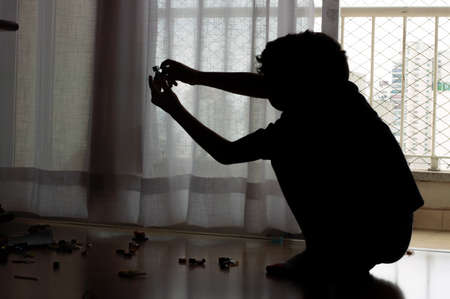 PTSD Mental health concept, Young depressed asian man sitting alone in dark room with low light environment, Selective focus.