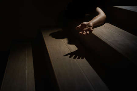 Woman sitting on the floor in the dark after shooting up with heroin; female drug addict after intravenous heroin injection wasted on the floor