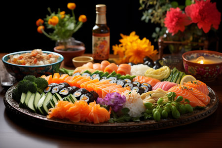 Discover an exquisite Japanese meal spread showcasing fresh sushi, sashimi, and vibrant vegetables, beautifully arranged with seasonal flowers for a luxurious dining experience.