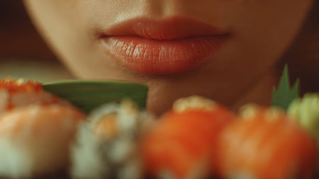 Close-up shot of a woman's lips near a plate of fresh sushi rolls. Focus on the vibrant colors and textures.