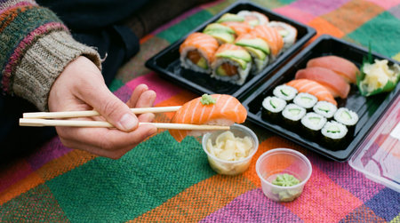 A close-up shot of a person hand holding a piece of salmon sushi with chopsticks. Takeout containers of sushi rolls and nigiri are visible in the background.