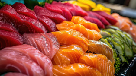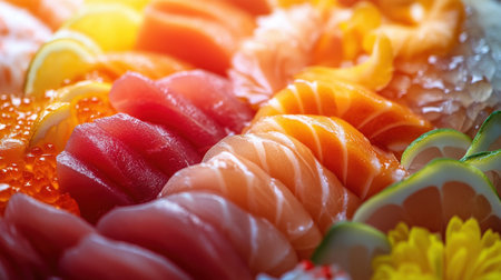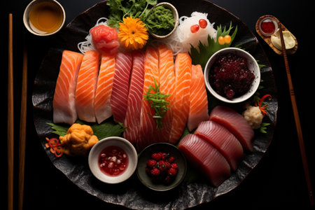 Fresh seafood sashimi plate, a gourmet Japanese delicatessen collection generated by artificial intelligence