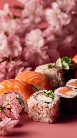 A vibrant sushi platter features various rolls and sashimi adorned with green garnish, surrounded by soft pink cherry blossoms on a warm pink backdrop.