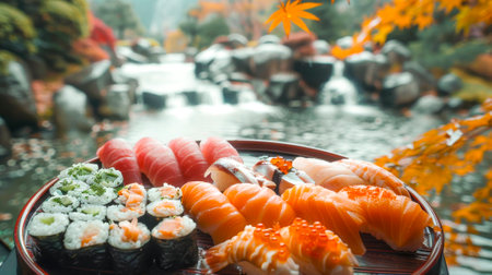 A vibrant platter of sushi delicacies is presented before an enchanting autumnal river setting, blending culinary art with natural beauty.