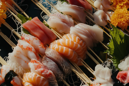 A stunning seafood platter featuring a variety of sushi and sashimi, beautifully arranged with vibrant colors and textures, perfect for gourmet cuisine enthusiasts.