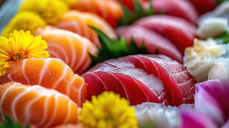A vibrant assortment of sushi made with various types of fish, garnished with edible flowers, served on a plate. The dish showcases bright colors and exquisite presentation.