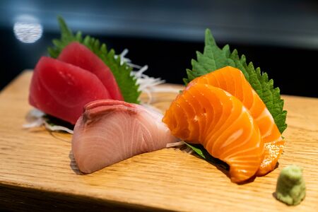 Sashimi traditional japanese cuisine, set of freshness raw salmon tuna and bass.