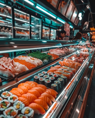 Assorted fresh sushi neatly displayed on a stainless steel and glass counter at a Japanese restaurant. Vibrant colors contrast with the blue, brown, and white background.