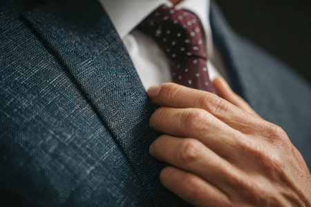 A confident professional fine-tunes his sophisticated navy blazer, complemented by crisp white and intricate burgundy accents, in a polished office environment.