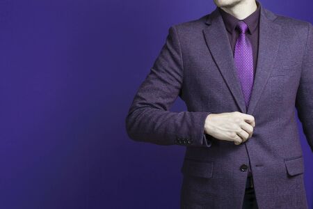 Close up of a businessman in a purple suit confidently on a dark blue background