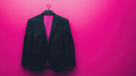 This image showcases a sleek black suit jacket neatly hung on a hanger against a striking pink background, perfect for fashion or business themes.
