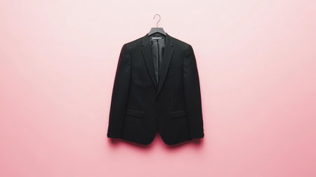 This image showcases a sleek black suit jacket gracefully hanging against a soft pink backdrop, ideal for fashion presentations and branding concepts.