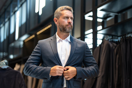A boutique consultant helps a customer find the perfect suit. A luxury store collection of premium suit designs. Elegant suit is perfect for business man. A well-tailored suit.