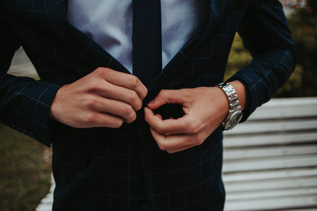 A selective focus shot of a male buttoning suit