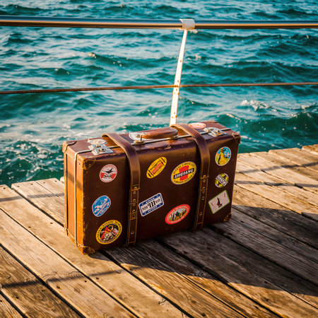 Vintage suitcase with travel stickers placed on a wooden dock by the sea