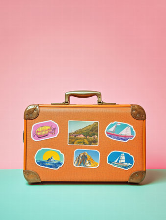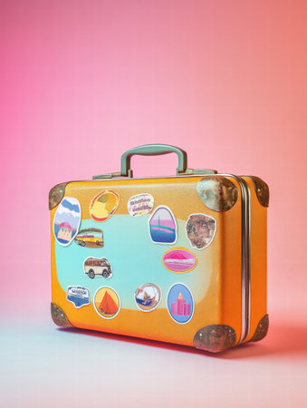 Bright retro suitcase with vibrant travel stickers reflecting joyful journeys and destinations waiting to be explored and enjoyed