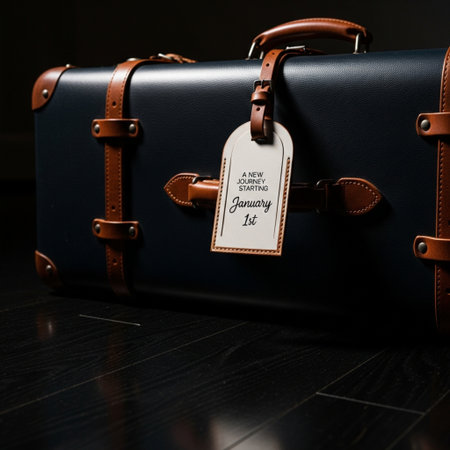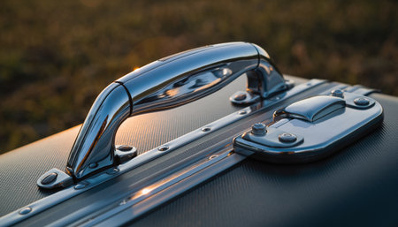 Close-up of a vintage suitcase featuring a brown leather handle, embodying travel nostalgia against a softly blurred background that enhances the sense of adventure.