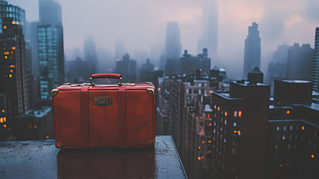 A vintage red suitcase placed on an urban rooftop creates a striking contrast against a foggy cityscape at dusk, evoking feelings of nostalgia and adventure.
