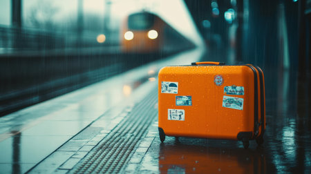 A bright orange suitcase adorned with travel stickers sits on a rain-soaked platform, with a train approaching in the distance, symbolizing adventure.