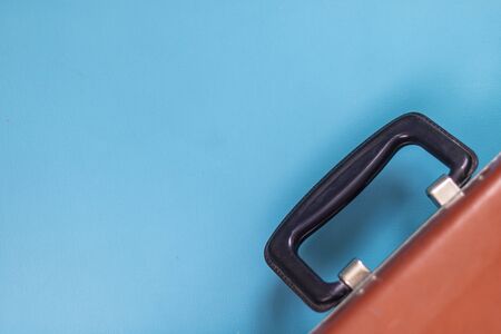Blue aquamarine background. On the right in the corner is the diagonal of the handle of a brown old retro classic travel and business suitcase. Copy space Business card