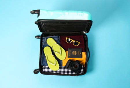 Time to travel. Travelling abroad. Summer holidays. Vacation concept. Colourful suitcase on blue backdrop, copy space