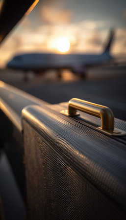 Close-up of a suitcase handle with a textured design, set against an airplane in the background. Captured in golden sunlight, this image emphasizes cinematic minimalism and travel.