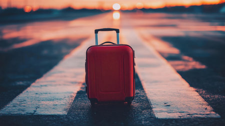 A striking red suitcase sits alone on a runway, illuminated by the warm glow of sunset. This image evokes feelings of travel, adventure, and exploration at twilight.