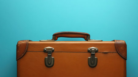A vintage leather suitcase with a classic design stands elegantly against a bright blue background, ideal for travel-themed projects or retro photography.