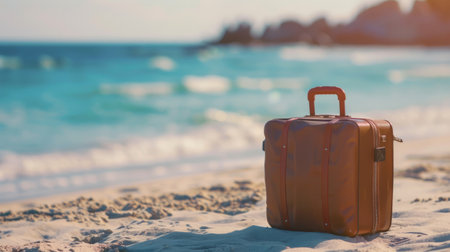 Modern brown suitcase in the sand, in front of a beach generative ai