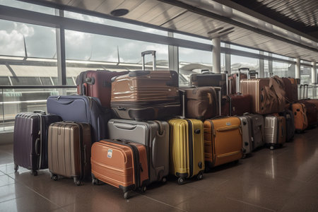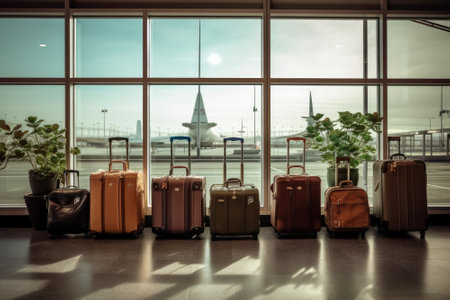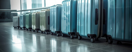a bunch of suitcases are lined up in a row in an airport terminal, waiting for passengers to board the plane or take off. . generative ai