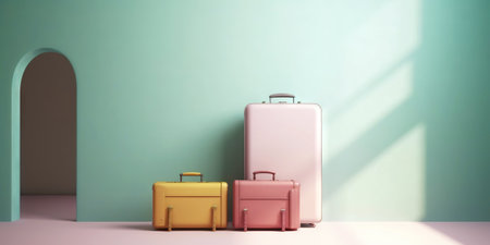 Pastel colored scene with travel suitcases, on uniform background. Trip concept. Generative AI.