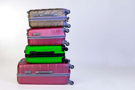 Colorful suitcases for family trip. Luggage and different accessories, white background.