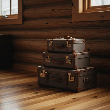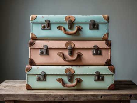 Several nostalgic travel suitcases arranged on a wooden table. The scene evokes memories of past journeys and symbolizes wanderlust and a longing for adventure.