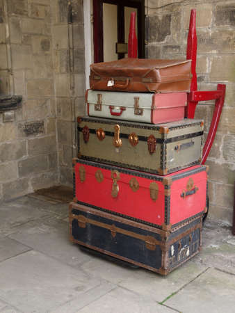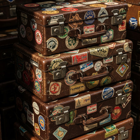 Detailed editorial photograph featuring old, heavily used leather suitcases adorned with vintage tra