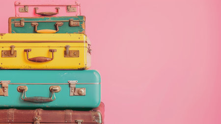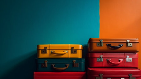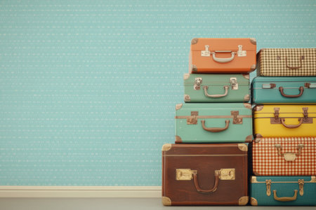 Vibrant and colorful vintage suitcases stacked neatly against a blue background, perfect for travel-themed designs, inspiring adventure and exploration ideas.