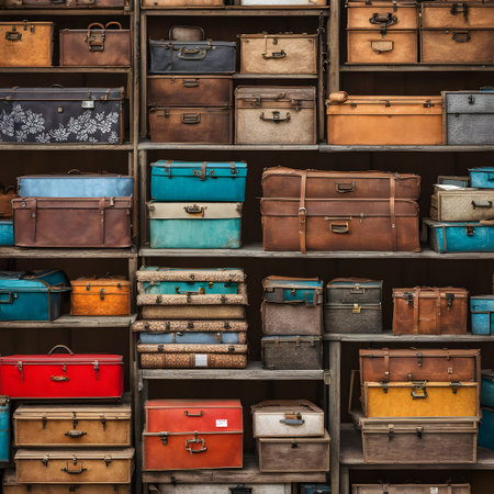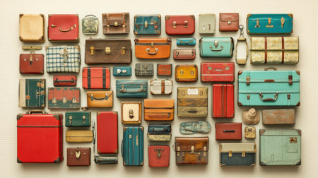 A vibrant display of vintage luggage pieces shows a colorful variety of shapes and sizes, perfect for travel enthusiasts or collectors. The unique designs showcase nostalgia and artistry, making it an ideal visual for creative projects.