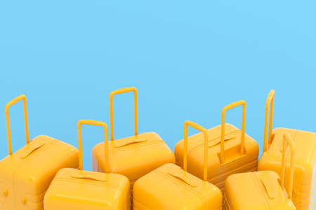 Colorful suitcase or baggage on monochrome blue background. 3D render of summer vacation concept and holidays