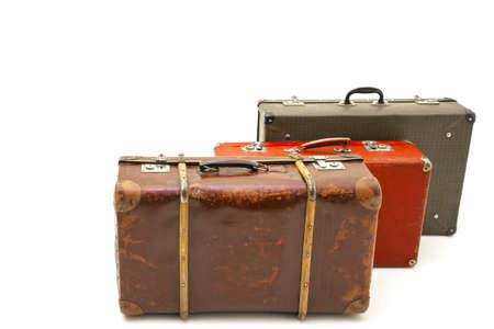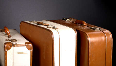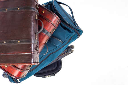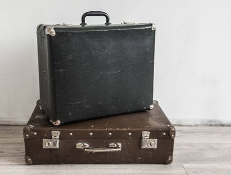 Old, retro, suitcases lie on the table with white background. Obsolete suitcase close up